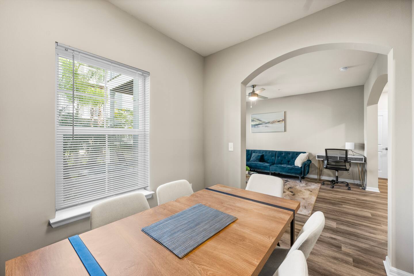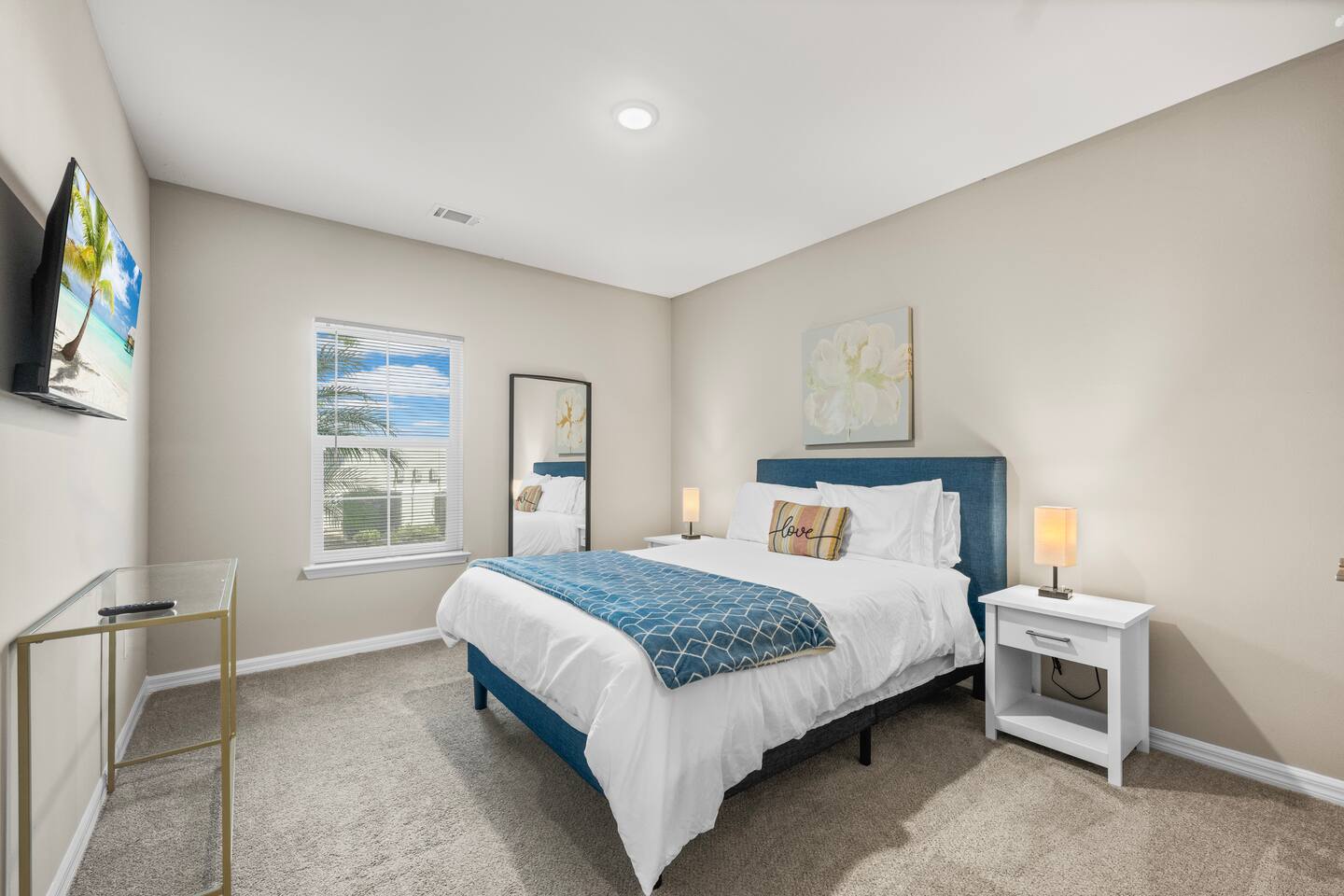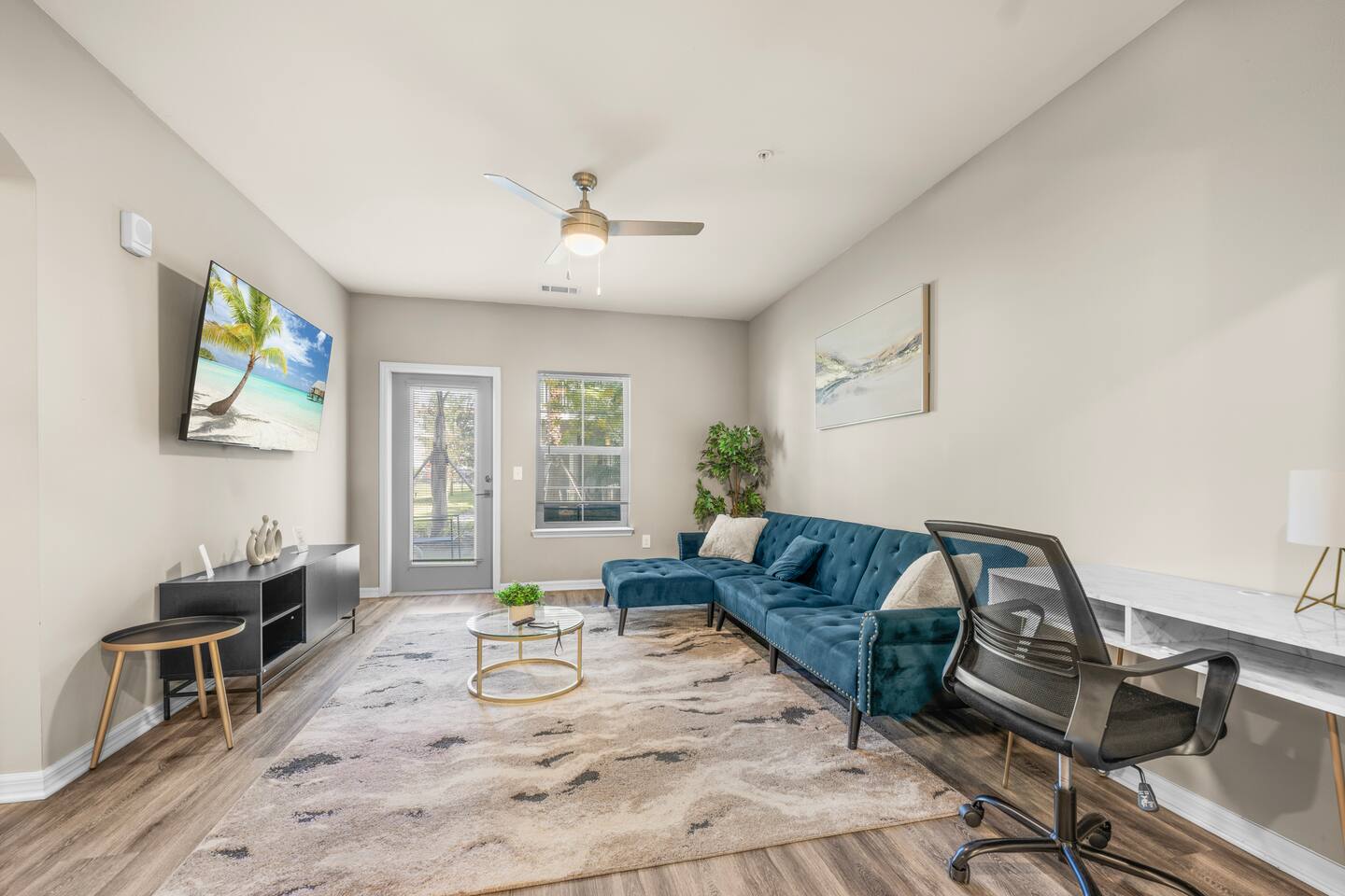 ★ Contemporary Oasis ★ Step into your meticulously curated retreat — a modern, ground-floor haven thoughtfully designed to blend style, function, and total relaxation. With upscale amenities, tasteful décor, and seamless accessibility (no stairs inside or out), this space invites you to unwind the moment you arrive. ★ Convenient Ground-Floor Access Enjoy a stress-free check-in and smooth mobility throughout your stay with direct, stair-free entry — perfect for travelers with luggage, kids, or anyone looking for ease and comfort. ★ LIVING AREA: Unwind in Comfort Whether you're curling up with a good movie or enjoying downtime with loved ones, the living space is your cozy centerpiece. ✔ 65” 4K Smart TV with Roku for premium streaming ✔ Plush sectional sofa adorned with soft pillows and blankets ✔ Coffee table for relaxed moments and evening chats ✔ Sleek office desk and chair — ideal for remote work or planning your next adventure ★ KITCHEN & DINING: Culinary Delights Everything you need to whip up a gourmet meal or a quick snack is right here in your fully stocked kitchen. ✔ Full suite of appliances: stove, oven, microwave, refrigerator, freezer, dishwasher ✔ Thoughtful extras: toaster, Brita water filter, coffee machine (with ground coffee), electric kettle ✔ Cookware, utensils, and essentials ready to go ✔ Cozy dining space with seating for four ★ BEDROOMS: Serene Retreat Recharge in two thoughtfully designed bedrooms offering peaceful, hotel-like comfort. ✔ Queen beds with soft pillows, quality linens, and cloud-like bedding ✔ Smart TVs for personalized in-bed entertainment ✔ Spacious wardrobes and storage to keep your space clutter-free ★ BATHROOMS: A Revitalizing Experience Refresh and rejuvenate in a spacious bathroom fully stocked with everything you need. ✔ Bathtub/shower combo for both quick rinses and relaxing soaks ✔ Soft towels, quality toiletries, and essentials provided for your convenience ★ Additional Amenities for Your Convenience ✔ In-unit washer and dryer for stress-free laundry ✔ High-speed Wi-Fi — ideal for streaming, video calls, and remote work ✔ Central A/C for personalized climate control ✔ Complimentary parking right outside ✔ Access to the on-site gym — stay active during your stay ★ Proximity Highlights — Explore with Ease • 5 mins to Andretti Thrill Park — go-karts, arcade, and family fun • 10 mins to Melbourne Beach — sun, surf, and scenic walks • 15–20 mins to USSSA Space Coast Complex • 10–20 mins to Costco, Walmart, and major shopping centers • 20–30 mins to Cape Canaveral & Kennedy Space Center This thoughtfully designed oasis offers more than just a place to sleep — it delivers a full lifestyle experience, where convenience, comfort, and modern luxury intersect. Whether you’re visiting for work, leisure, or a bit of both, this is your home base for everything the Space Coast has to offer. Book now and experience the elevated comfort of your ultimate retreat.