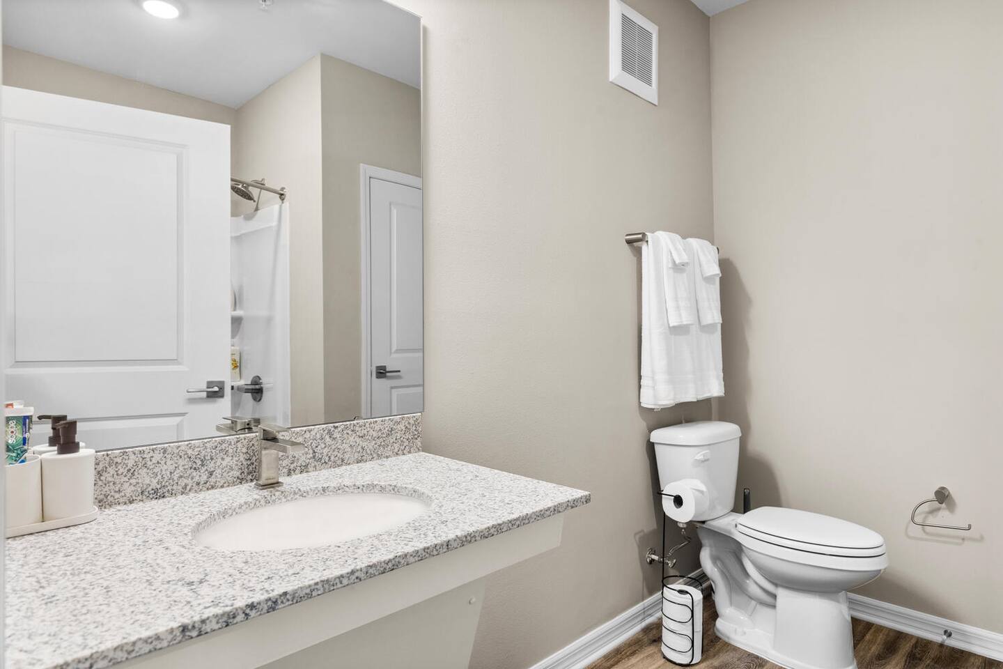 ★ Contemporary Oasis | Ground-Floor Comfort Meets Modern Living ★ Welcome to your beautifully curated retreat, where thoughtful design and elevated comfort come together in a fully accessible, ground-floor unit—perfect for relaxation, work, or adventure. 🛋️ LIVING AREA: Unwind in Comfort Enjoy peaceful moments or entertainment in this cozy, stylish living space: ✔ 65” 4K Smart TV with Roku ✔ Plush sectional sofa with inviting pillows and blankets ✔ Coffee table ideal for quiet mornings or evening chats ✔ Office desk + chair for remote work or creative planning 🍽️ KITCHEN & DINING: Culinary Delights Await Everything you need to prepare meals, snacks, or your favorite brew: ✔ Full appliance suite: stove, oven, microwave, fridge, freezer, dishwasher ✔ Extras include toaster, Brita water filter, coffee machine, electric kettle ✔ Fully stocked cookware, utensils, and a dining space for four 🛏️ BEDROOMS: Serene Retreat Recharge in thoughtfully designed, tranquil bedrooms: ✔ Queen beds with plush linens and cozy pillows ✔ Smart TVs in each room for private entertainment ✔ Ample wardrobes for organized storage 🛁 BATHROOMS: A Revitalizing Experience Your private sanctuary for refreshment and relaxation: ✔ Bathtub and shower combo ✔ Stocked with fresh towels, toiletries, and daily essentials 🌟 Additional Amenities ✔ In-unit washer & dryer for total convenience ✔ High-speed Wi-Fi for seamless work or streaming ✔ Central air conditioning for customized comfort ✔ On-site gym for staying active on your schedule ✔ Complimentary parking for easy, hassle-free arrival 📍 Proximity Highlights – Explore Melbourne with Ease 🚗 2–3 mins to Andretti Thrill Park 🏖️ 5–10 mins to Melbourne Beach ⚾ 15–20 mins to USSSA Space Coast Complex 🛍️ 10–15 mins to Costco, Walmart, and shopping/dining 🚀 20–30 mins to Cape Canaveral & Kennedy Space Center 🌴 Your Modern Florida Retreat Awaits Whether you're here for business, beach days, or a relaxing getaway, this Contemporary Oasis offers the perfect balance of comfort, convenience, and modern elegance. Book now and discover your elevated stay on Florida’s Space Coast.