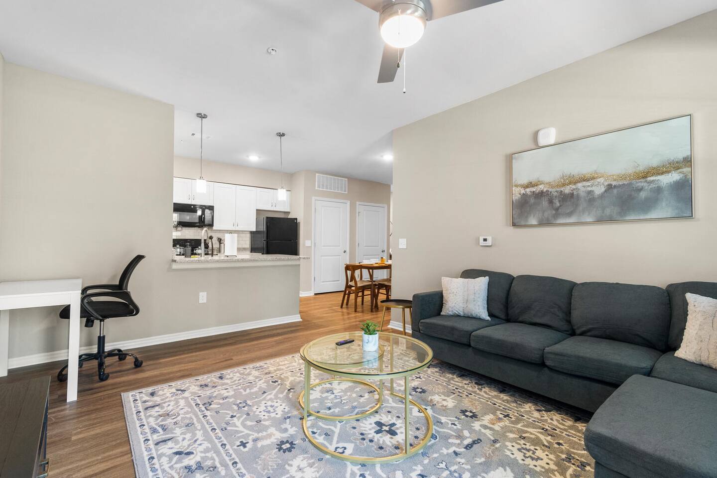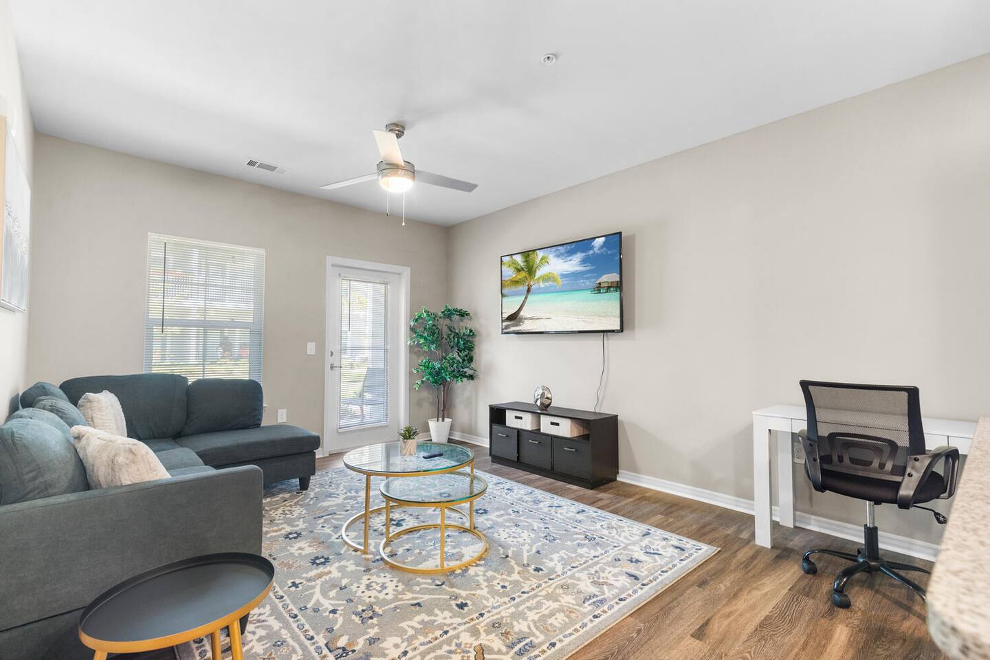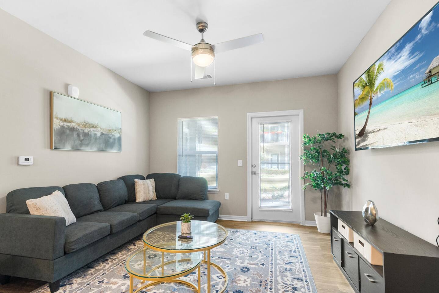 ★ Tranquil Modern Retreat | Ground-Floor Comfort Meets Modern Style ★ Welcome to your peaceful escape, where thoughtful design and seamless accessibility create a space perfect for rest, productivity, and play — all just minutes from Melbourne Beach. 🛋️ LIVING AREA – Unwind & Recharge ✔ 65” 4K Smart TV with Roku for premium entertainment ✔ Plush sofa sectional with cozy pillows ✔ Office desk & chair for remote work or journaling ✔ Stylish coffee table for shared moments and laid-back lounging 🍽️ KITCHEN & DINING – Fully Equipped Culinary Space ✔ Full range of appliances: stove, oven, microwave, fridge, freezer, dishwasher ✔ Mornings made better with toaster, Brita filter, coffee machine (with coffee), and electric kettle ✔ Ample cookware, utensils, and dining essentials to make you feel at home 🛏️ MASTER BEDROOM – Your Personal Retreat ✔ Queen bed with plush linens and pillows ✔ 40” 4K Roku Smart TV for in-bed entertainment ✔ Spacious wardrobe with hangers, shelves, and room to unpack 🛁 BATHROOM – Refresh & Rejuvenate ✔ Bathtub/shower combo for comfort and versatility ✔ Fresh towels, toiletries, and essentials included 🌟 Additional Amenities ✔ In-unit washer & dryer ✔ On-site gym for fitness on your schedule ✔ Complimentary parking just outside the unit ✔ High-speed Wi-Fi for work or streaming ✔ Central air conditioning for custom climate control 📍 Proximity Highlights – Prime Space Coast Location 🚗 2–3 mins to Andretti Thrill Park 🏖️ 5–10 mins to Melbourne Beach ⚾ 15–20 mins to USSSA Space Coast Complex 🛍️ 10–15 mins to Costco, Walmart & local shopping 🚀 20–30 mins to Cape Canaveral & Kennedy Space Center 🌴 Your Modern Haven by the Coast Awaits Whether you're visiting for a beach getaway, business trip, or relaxing retreat, this tranquil space delivers comfort, connection, and convenience in every corner. Book now and experience the elevated side of Melbourne.