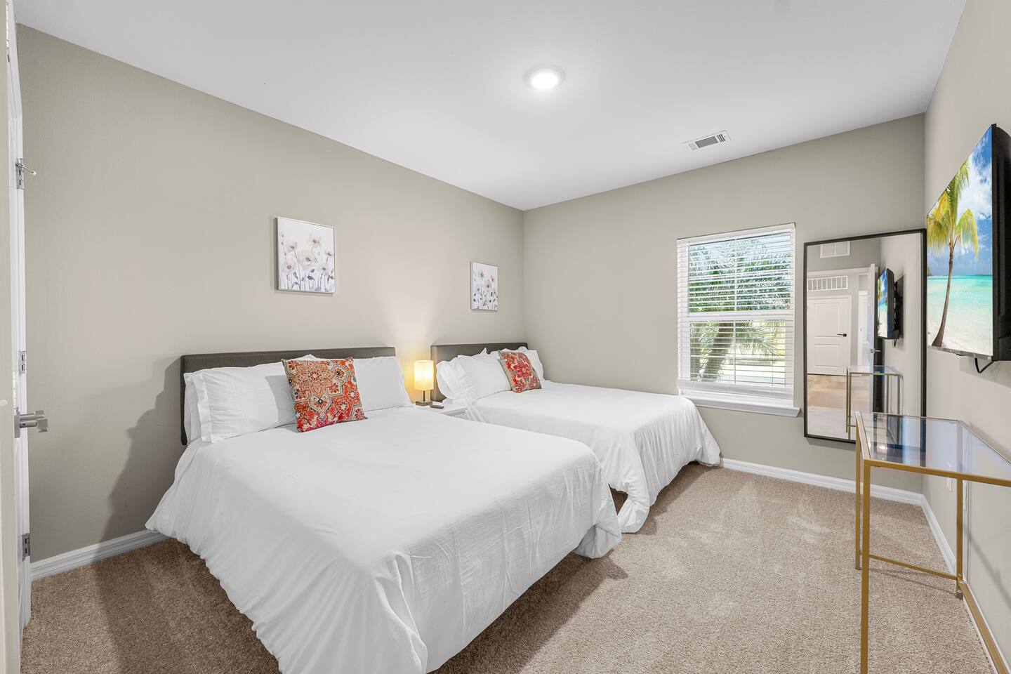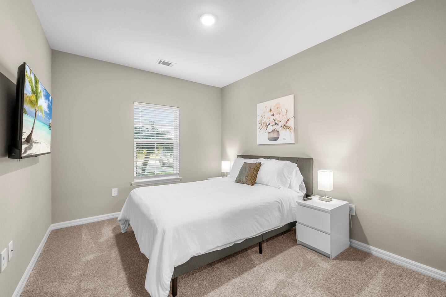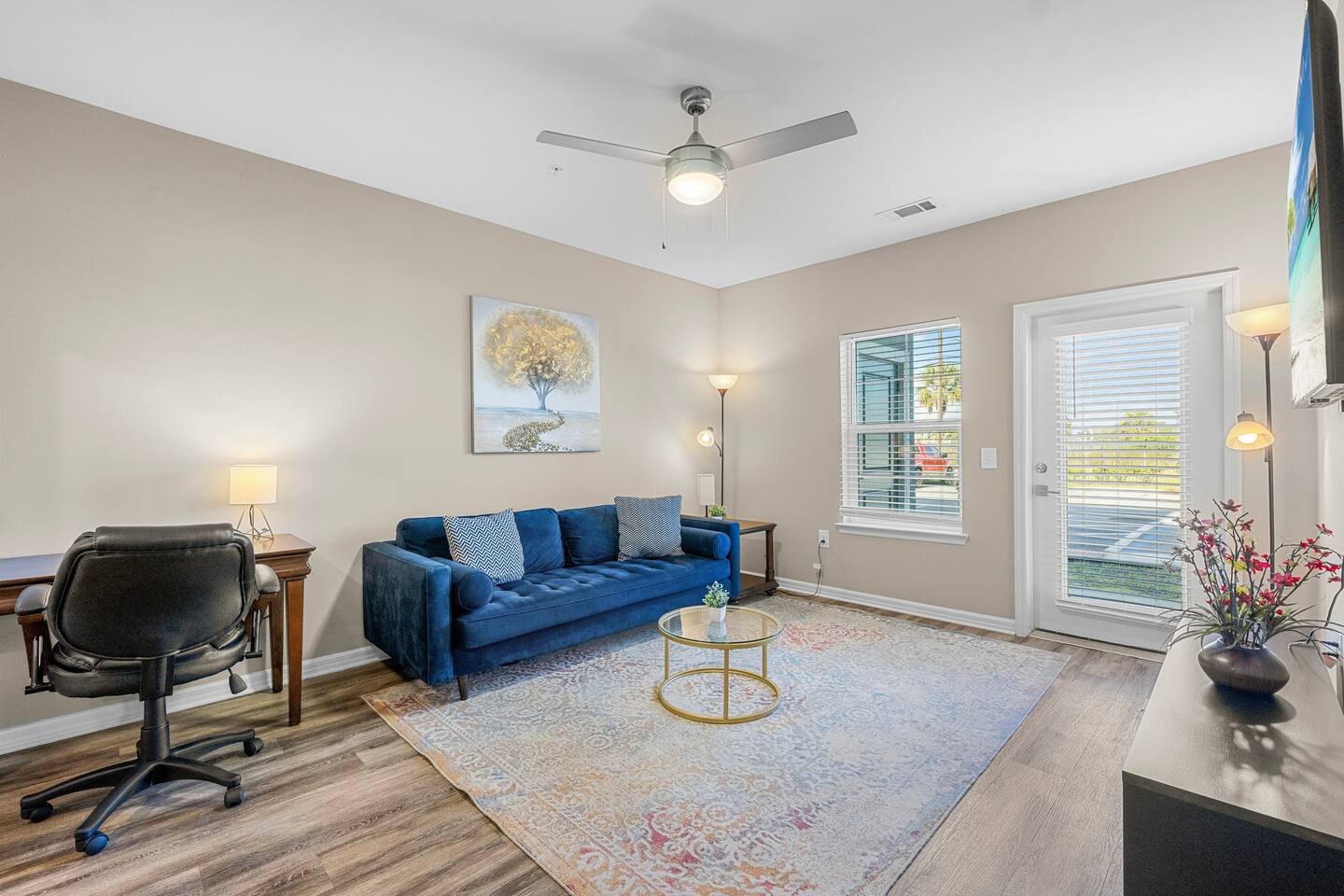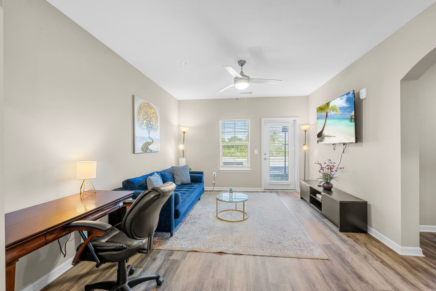 ★ Contemporary Oasis ★ Prepare to be captivated by this meticulously curated contemporary haven, featuring impeccable amenities and an inviting ambiance. ★ Convenient Ground-Floor Access Accessible without stairs, this ground-floor retreat ensures a seamless entry, providing an effortless start to your stay. ★ LIVING AREA: Unwind in Comfort At the heart of comfort, this cozy space invites relaxation and cherished moments with loved ones. ✔ 65” Flat-Screen 4K Smart TV with Roku ✔ Plush Sofa Sectional adorned with Inviting Pillows and Blankets ✔ Coffee Table for Tranquil Moments ✔ Stylish Office Desk and Chair for Work or Creativity ★ KITCHEN & DINING: Culinary Delights Discover a fully-equipped kitchen that beckons culinary exploration. ✔ Comprehensive Range of Appliances: Stove, Oven, Microwave, Refrigerator + Freezer, Dishwasher ✔ Convenient Amenities: Toaster, Brita Water Filter, Coffee Machine with Ground Coffee, Electric Kettle ✔ Complete Cookware Setup ✔ Cozy Dining Space for Four ★ BEDROOMS: Serene Retreat Indulge in restful nights within these thoughtfully designed sleeping quarters. ✔ Queen Beds adorned with Plush Pillows, Linens, and Sheets ✔ Smart TVs for Your Entertainment Pleasure ✔ Ample Wardrobes for Convenient Storage ★ BATHROOMS: Revitalizing Experience Rejuvenate in spacious, fully-stocked bathrooms offering all you need for a refreshing stay. ✔ Bathtub and Shower for Relaxation ✔ Complimentary Toiletries, Fresh Towels, and Essentials ★ Additional Amenities★ ✔ In-Unit Washer and Dryer for Added Convenience ✔ On-Site Gym within the Complex for Fitness Enthusiasts ✔ Complimentary Parking for Hassle-Free Arrival ✔ High-Speed Wi-Fi for Seamless Connectivity ✔ Central Air Conditioning for Personalized Climate Control ★ Proximity Highlights ★ Explore the vibrant surroundings: • 2-3 mins drive to Andretti Thrill Park • 5-10 mins drive to Melbourne Beach • 15-20 mins drive to USSSA Space Coast Complex • Convenient Access to Shopping, Dining, and Activities • 10-15 mins to Costco and Walmart • 20-30 mins drive to Cape Canaveral This meticulously crafted space promises a fusion of comfort, convenience, and modernity, ensuring an extraordinary stay. Welcome to your ultimate retreat!